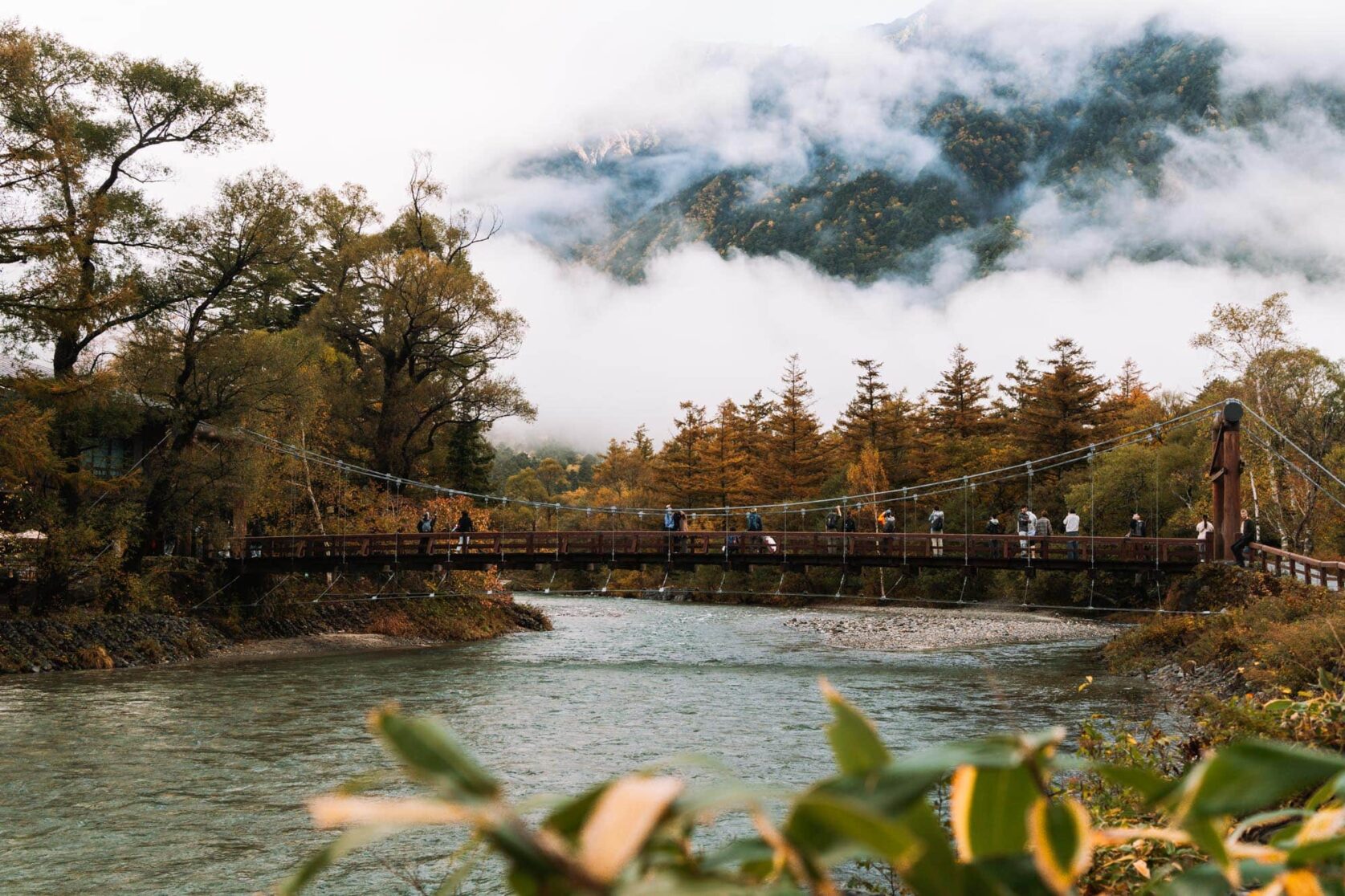 Vlak voordat je Myōjin Pond bereikt, steek je de rivier over by way of de wiebelige houten Myōjin Bridge. De brug doet een beetje denken aan de centrale Kappa Bridge, maar heeft zijn eigen charme. Het is hier rustiger, en je hebt uitzicht op niets anders dan natuur. Doordat het hier stiller is, kun je echt even stilstaan om te genieten van het uitzicht over de rivier en de bergen.